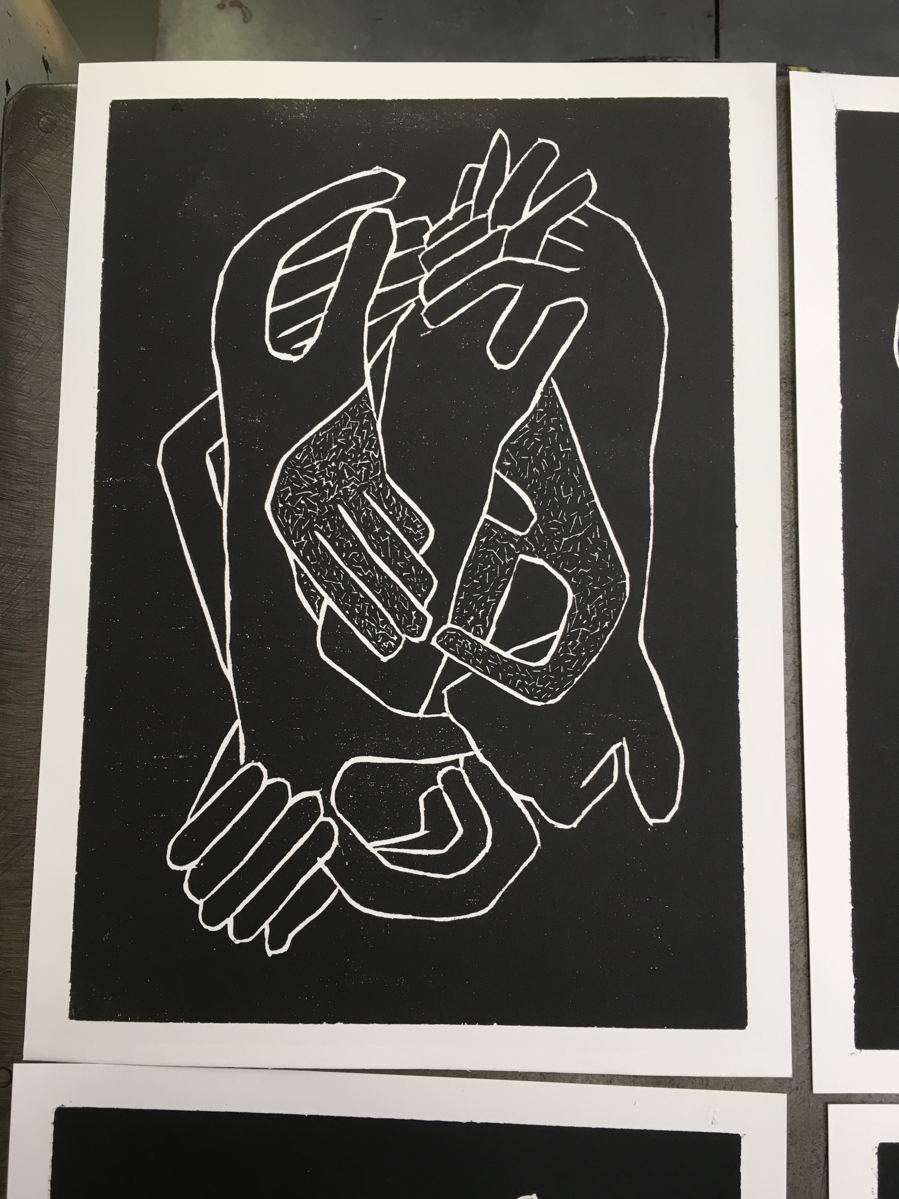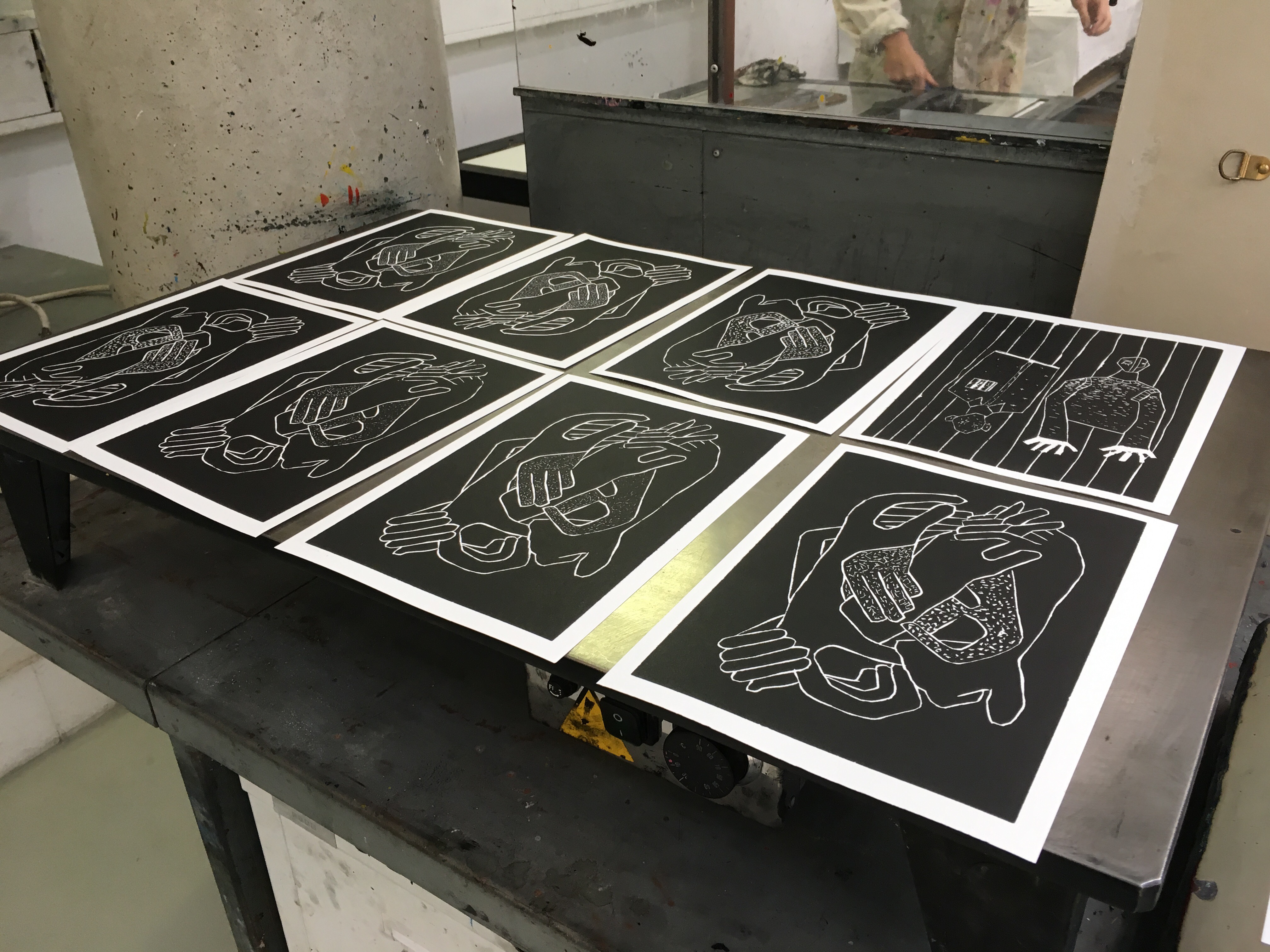 Terminé mi grabado en madera e imprimí 7 en vez de 5! jajaja estuvo entretenido y siempre somos los mismos que terminamos juntos. Francine y otro más que no logro acordarme de su nombre……son muy simpáticos conmigo y vamos adelantados. Secamos las muestras y quedaron preciosas!