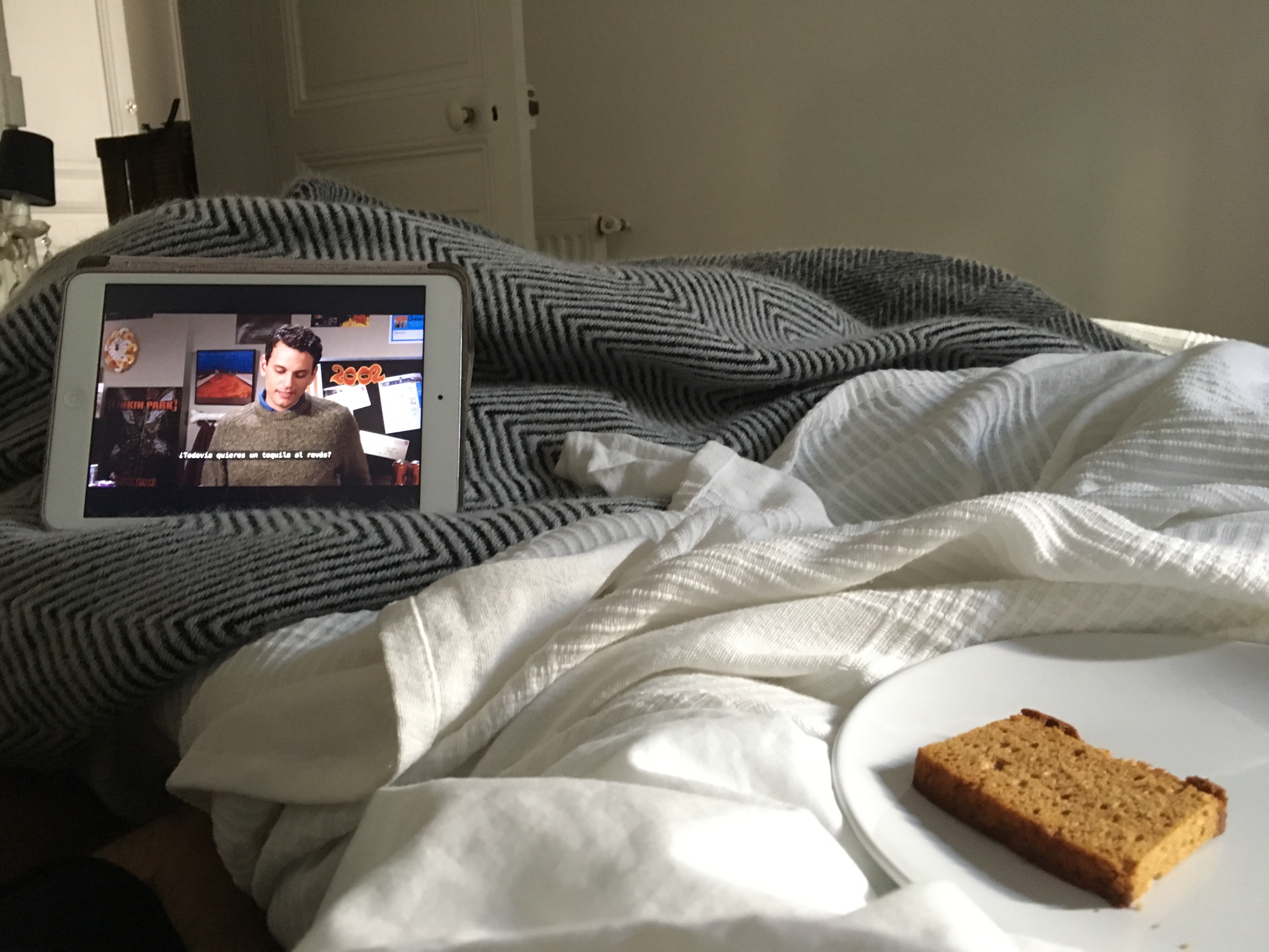 Almorzamos juntos eso sí! La noche anterior había hecho una rica sopa de verduras y nos quedaba couscous que lo adornamos con berenjenas y chalotas. Estuvo todo muy rico, se nos pasó la tarde hasta que partí a mis clases de francés. A la vuelta, congelada porque habían 7 grados y salí sin chaleco, el maldi me esperaba con panqueques para la comida.
