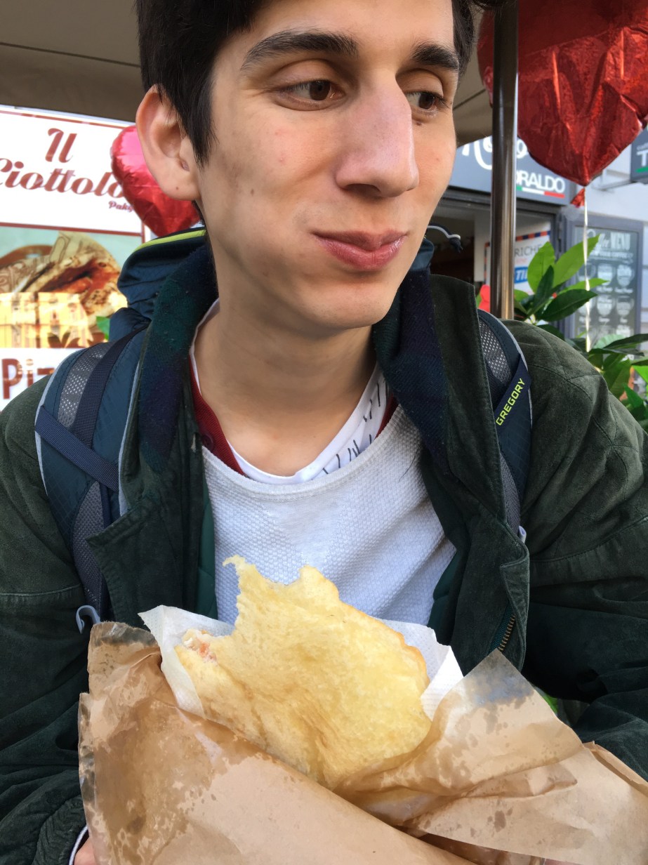 Seguimos dando vueltas hasta ir a los alrededores de la catedral y aprovechar de dar el último paseito, de manera que terminamos llegando (de manera no accidental) a la misma cafetería del día anterior a tomar un segundo desayuno, dejar pasar un poco la hora. Estuvo entretenido. Como ya estamosmedios viejos, nos fuimos al hotel a buscar nuestras cosas con el plan de ir temprano al aeropuerto, pero antes pasé a comprarme una pizza fritta (que literalmente es una pizza frita). En Pompeya habíamos probado una que estaba asquerosa, así que no le tenía mucha fe, pero dado que es la especialidad de la ciudad decidimos darle una segunda chance. Y afortunadamente porque estaba exquisita! Era un lugar que se veía medio turístico en la Piazza Garibaldi pero que termino siendo un verdadero manjar, como una empanada pero versión pizza. Tenía mozzarela, salsa de tomate y ricotta.