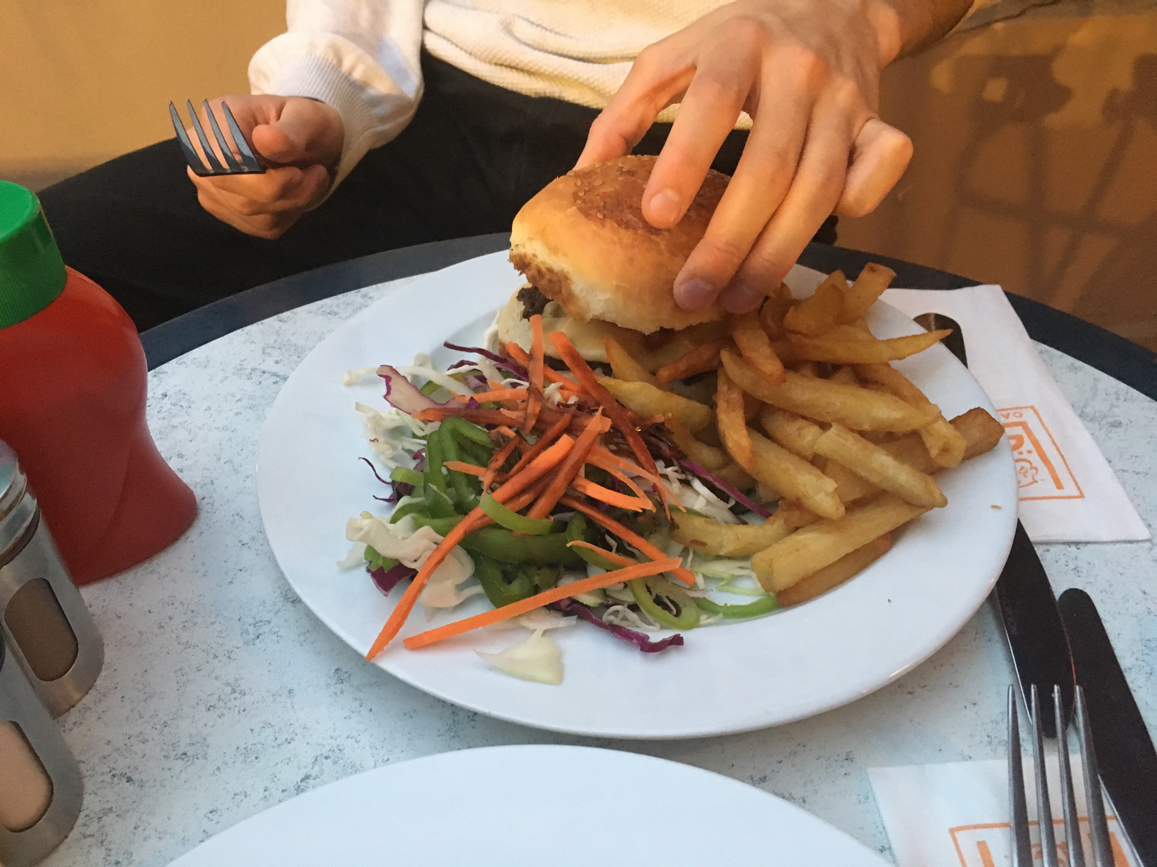 El parque era lindo, pero nada tan especial. Quizás era porque se parece a algunas parte de Chile y no era algo tan sorprendente para nosotros. De todas maneras caminamos por el sendero y encontramos un lugarcito con sombra para comer nuestras ensaladillas de almuerzo y mojar las patitas en el río. Habíamos llevado una ensalada de fideos, pepino, aceitunas y jamón, mientras que la otra era de tomate con feta y un poco de jamón. Estaba muy muy rico, el agua del río era “heladita” y era muy rica la sensación de remojarse ahí mientras fuera del agua hacían cerca de 40 grados. Estuvimos un buen rato ahí echados, vimos como se nos acercaban las hormigas porque teníamos comida y les pusimos un pedacitos de pepino lejos nuestro para distraerlas. Fue entretenido ver como se organizan para ir a atacar un pedacito de comida: Primero una lo encuentra, se queda mirándolo como dos minutos. Después se va y vuelven unas cuatro hormigas a repetir el mismo proceso. A los 10 minutos tienes un centenar de hormigas rodeando un pedacito de pepino, mirándolo y acercándose lentamente. Después de unos 5 minutos más algunas se suben encima y se pasean. Nunca supimos si comieron algo o estaban puro weveando, pero antes de irnos las aplasté con una piedrita.